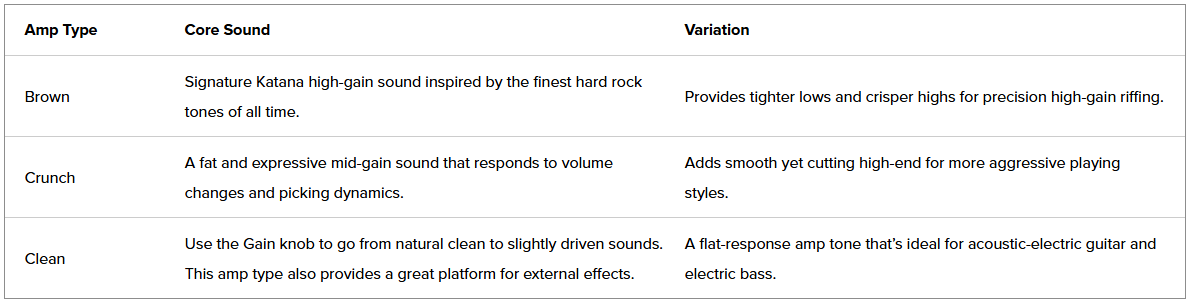Katana Mini X features versatile amp characters derived from our stage-class Katana amp series. Three core amp sounds are available, along with a tonal variation that's accessible with a panel switch. The clean amp variation provides an uncolored sound for using Katana-Mini X with an acoustic-electric guitar or bass.